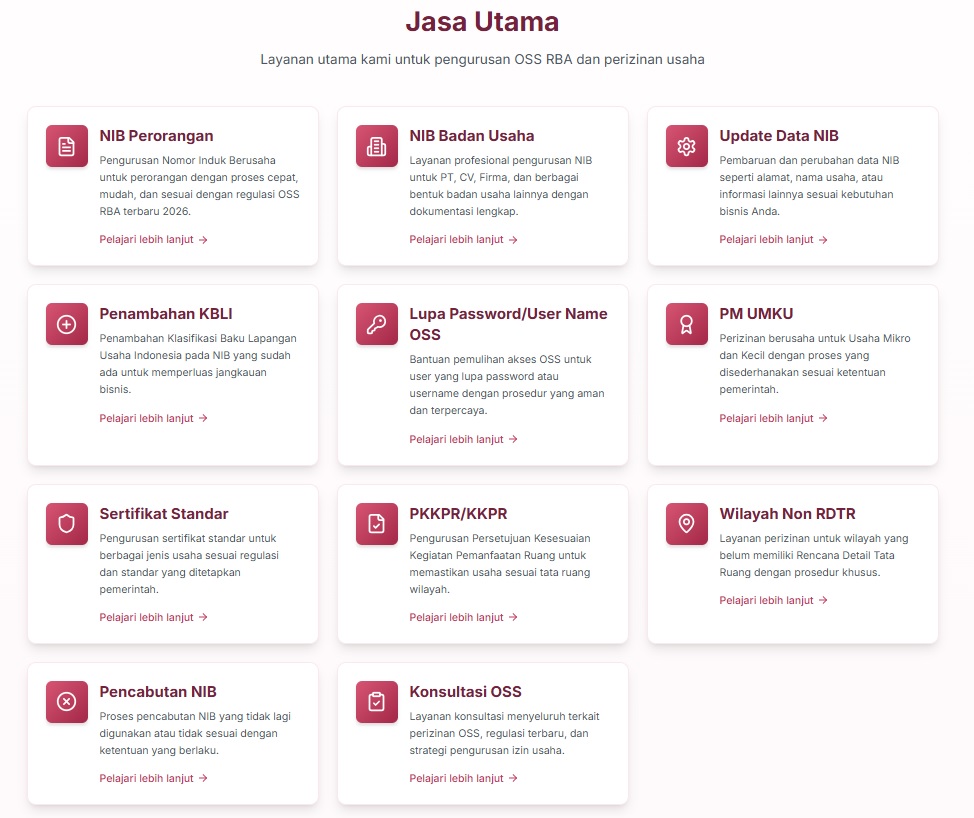 Penyedia jasa profesional untuk pengurusan OSS RBA terbaru 2026, sesuai dengan Peraturan Pemerintah Nomor 28 Tahun 2025 dan Peraturan Menteri Investasi Nomor 5 Tahun 2025.